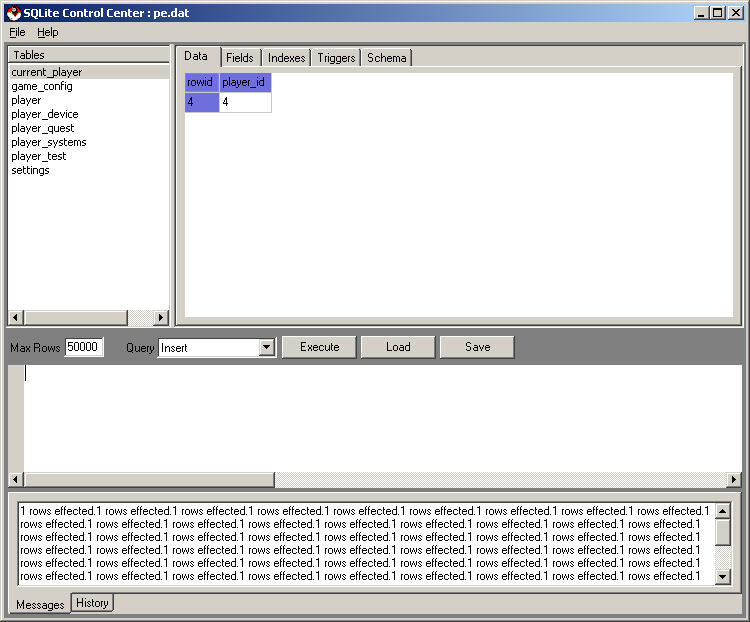 Copy and paste this code (modifying the first number in 'VALUES' if your current player is not 4) into the Sqlite Browser window as shown below.