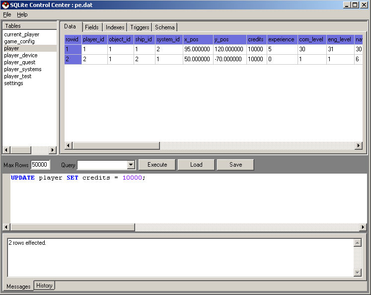 As you can see, this table has two rows in it. The reason is I have created two player ships in my game. There are many columns that you can not see because not all of the columns in the player table will fit across my screen for the screen shot, but of the ones you can see, you'll notice that one of the columns is "credits". This is the number of credits that a particular player ship has in the game. Well, it looks like the first ship has WAY more money than the second ship... and that's not really fair now is it? So, being the semi-socialist left wing turkey that I am, I'm going to level the playing field by executing the following statement:
